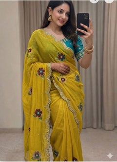 Star George with embroidery work and really mirr all over butufull flavras and work Emrodairy Full Worked Saree With Blouse
